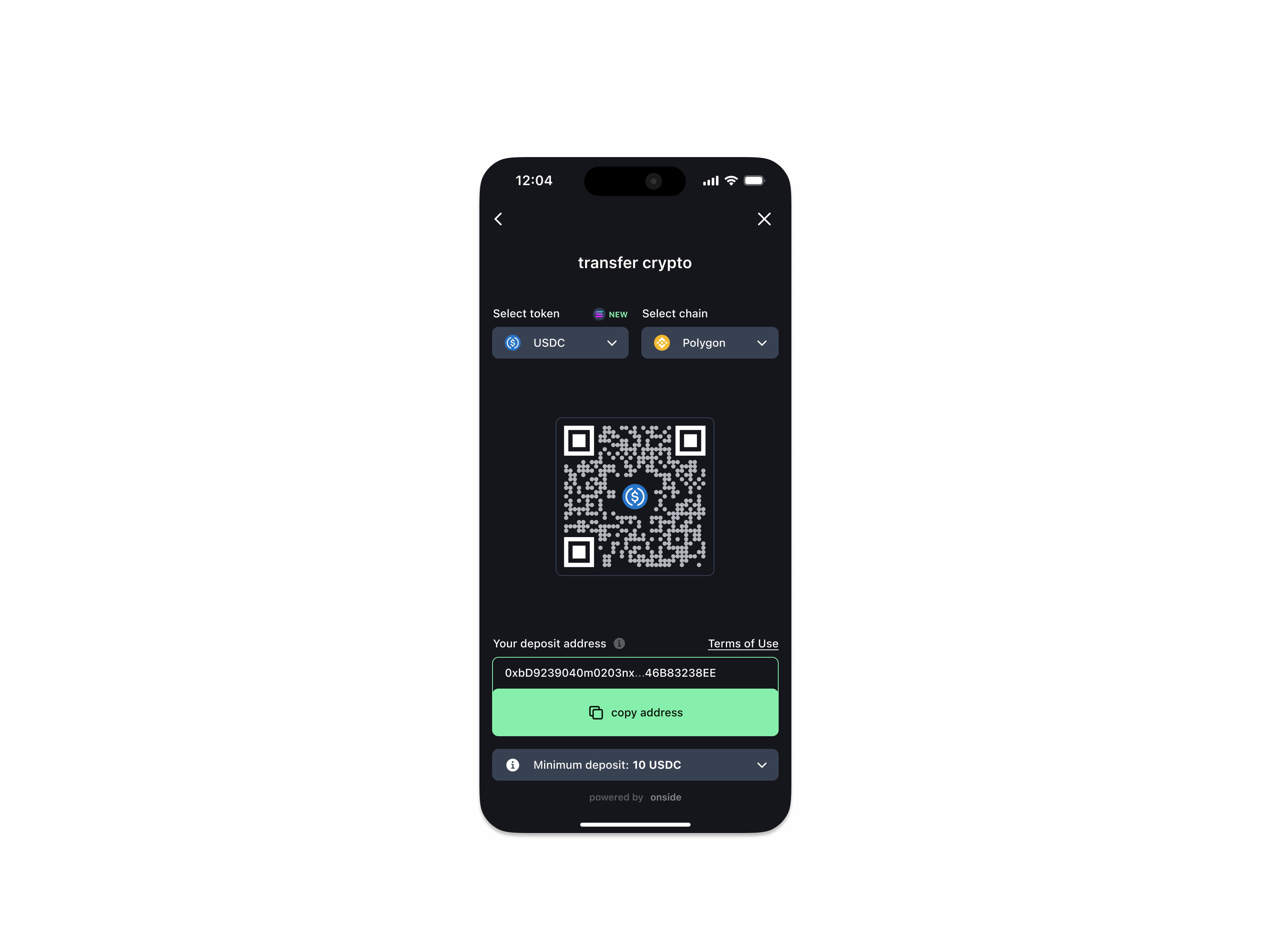 The Onside Flow widget launches, prompting the user to send their chosen crypto (e.g., ETH on Polygon) to a uniquely generated deposit address.